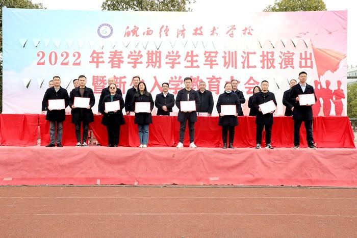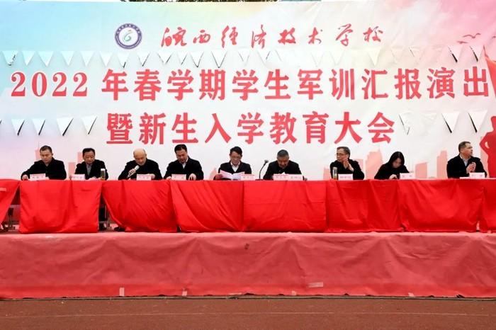 军训汇演展风采,飒爽英姿致青春。3月6日下午,皖西经济技术学校足球场上军歌嘹亮、彩旗飞扬,在此隆重举行2022年春学期学生军训汇报演出暨新生入学教育大会。来自全县各乡镇1100余名新生怀揣着对崭新校园生活的向往和热情,以昂扬向上的精神态度迎接检阅,圆满完成了“入学第一课”。全体校领导、2022级春招新生班主任参加大会。副校长李正局主持本次大会。