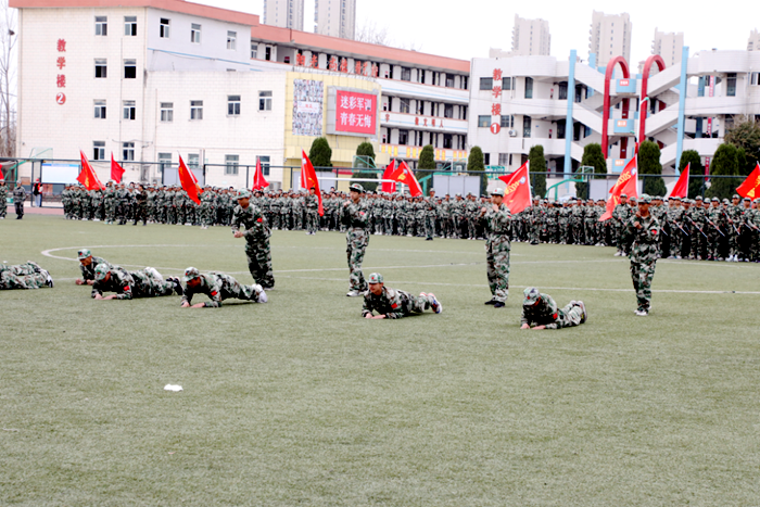 军训汇演在雄壮的国歌声中拉开帷幕,学校党委书记、校长王秀江宣布军训汇演开始,1100余名新生军容严整、目光坚定、英姿飒爽、步履铿锵,列阵走过主席台接受学校领导和全校师生的检阅。铿锵的口号响彻云霄、燃爆全场。手语操、韵律操等表演精彩纷呈、依次呈现,将汇演推向了高潮。班队列整齐划一、震撼人心;匕首操“杀”气袭人、动作利落;擒敌拳表演威武有力、霸气神勇……