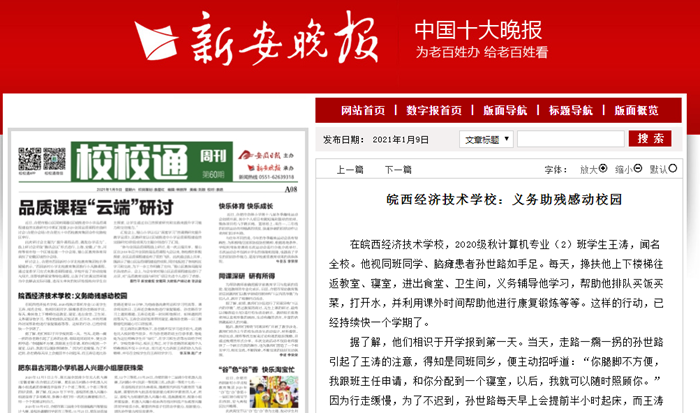 王涛同学开朗活泼,大方自信,集体荣誉感较强,是老师心目中的好帮手,也是同学心目中的知心伙伴和学习榜样。作为班级生活委员,他热心班级各项事务,总是以身作则、以大局为重,坚持为同学服务,赢得了老师们的称赞。他曾因义务助残被安徽网、中安教育网、新安晚报、皖西日报等多家媒体广泛报道,他视同班同学、脑瘫患者孙同学情如手足,每天搀扶他上下楼梯往返教室、寝室和食堂,帮助他复习功课,帮他买饭买菜、打开水等,并利用周末等课外时间帮助他进行康复训练,不怕苦不怕累,感动了老师和同学们,也感动了整个校园。王涛同学在学习上严格要求自己,学习目的明确,态度端正,上课认真听讲,课下认真完成各项作业,他不仅认真学习文化课和专业课,还积极参加体育运动,并持之以恒。