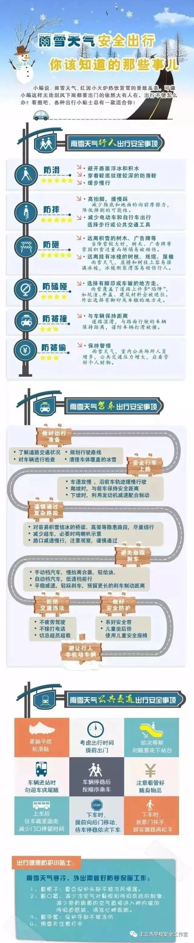 1、关注天气预报和学校通知,及时调整上学放和接送孩子时间,注意上放学和接送孩子途中交通安全。