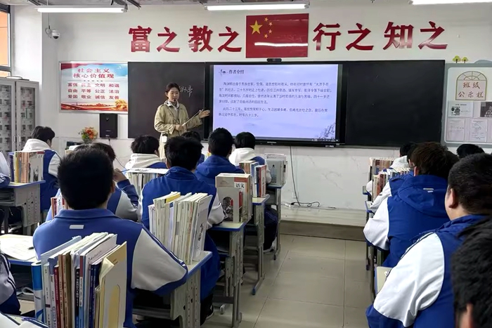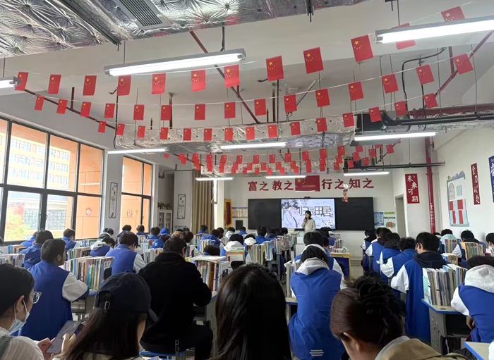 课堂展示环节中,四位授课教师结合教学内容巧思设计,呈现了风格各异的精彩课堂。语文组钱银玉、余曼老师同授《归园田居・其一》,钱银玉老师侧重引导学生品读诗句,通过反复诵读与意象分析,带领学生感受田园诗的恬淡意趣;余曼老师则结合东晋的时代背景,引导学生理解陶渊明辞官归隐的精神追求,在文本解读中渗透人文素养培育。