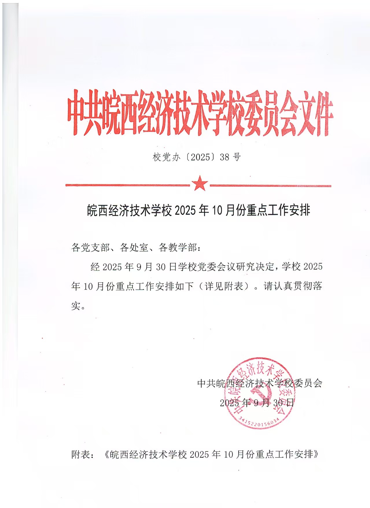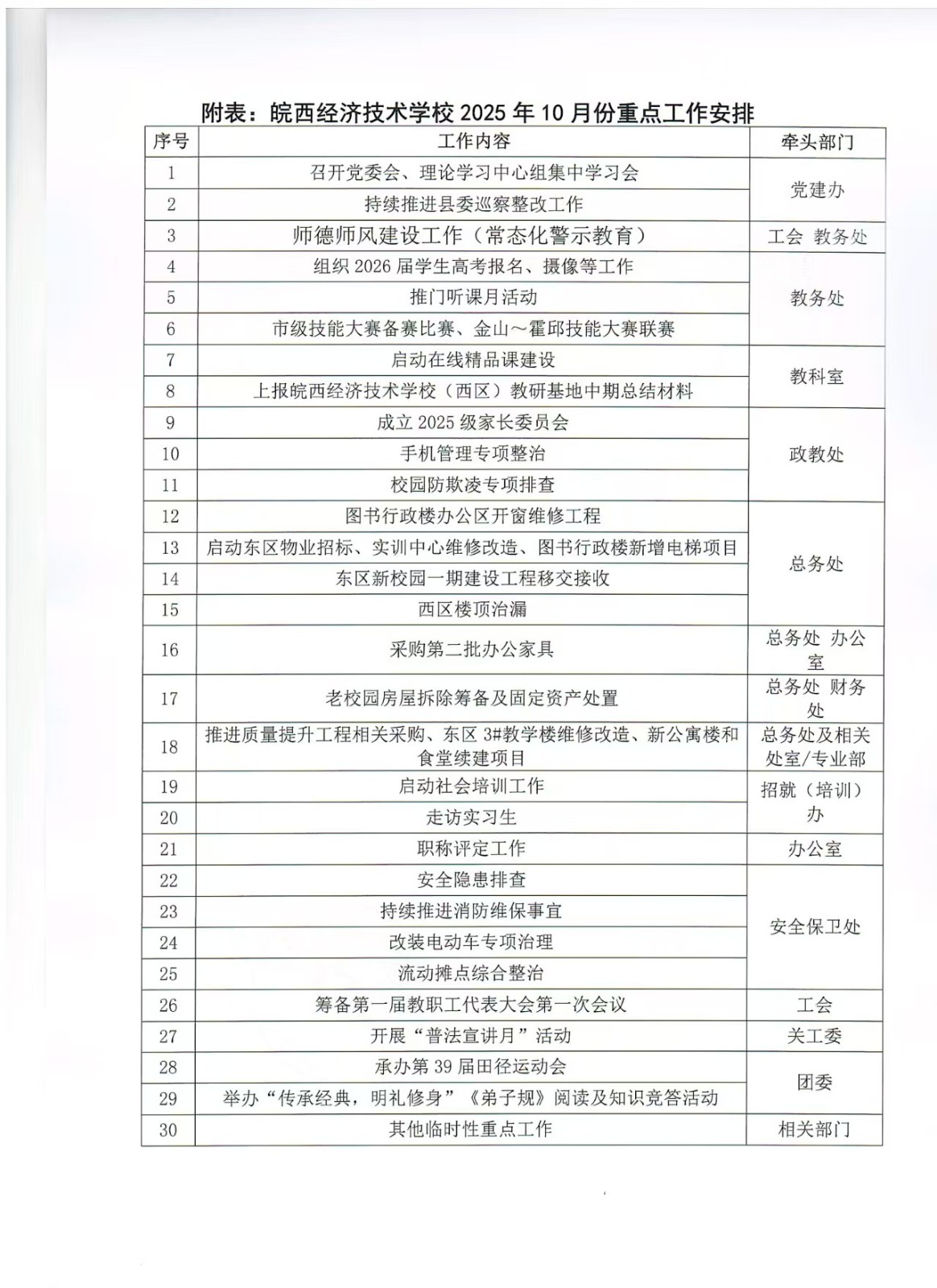 皖西经济技术学校2025年10月份重点工作安排