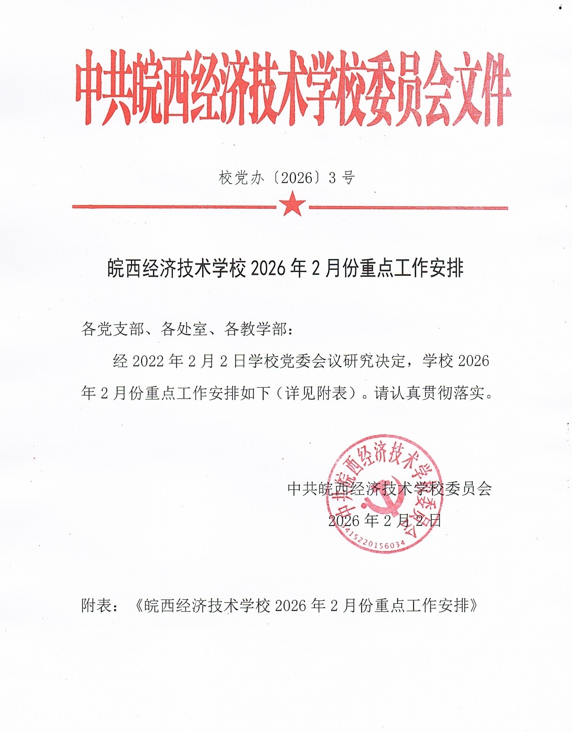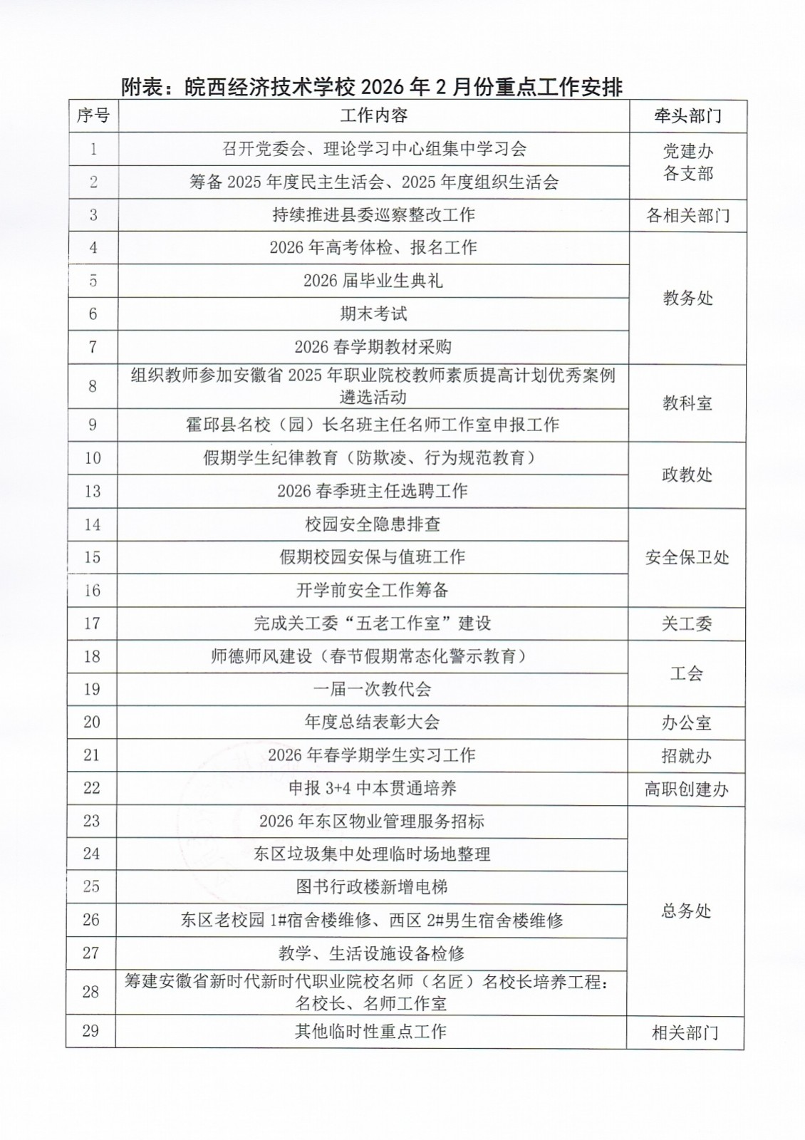皖西经济技术学校2026年2月份重点工作安排